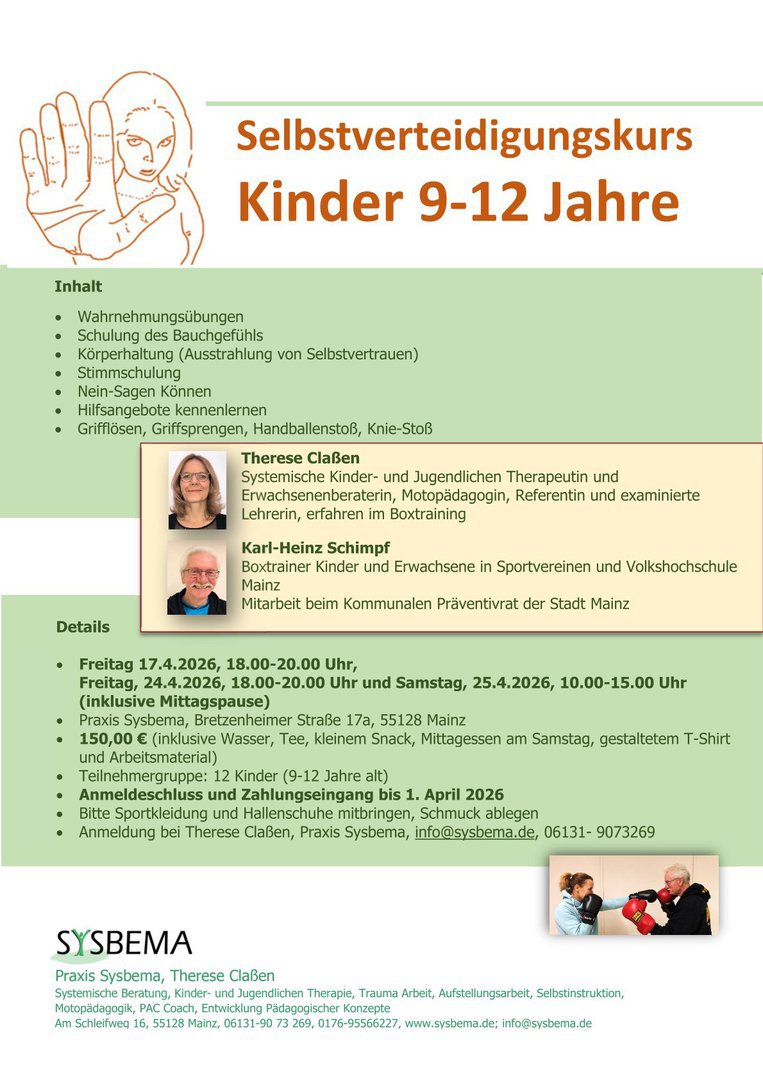 Gemeinsam mit Karl Heinz Schimpf als Boxtrainer biete ich regelmäßig Selbstverteidigungskurse für Kinder, Jugendliche und Frauen an. Bitte melden Sie sich bei Interesse, dass ich Sie vormerken